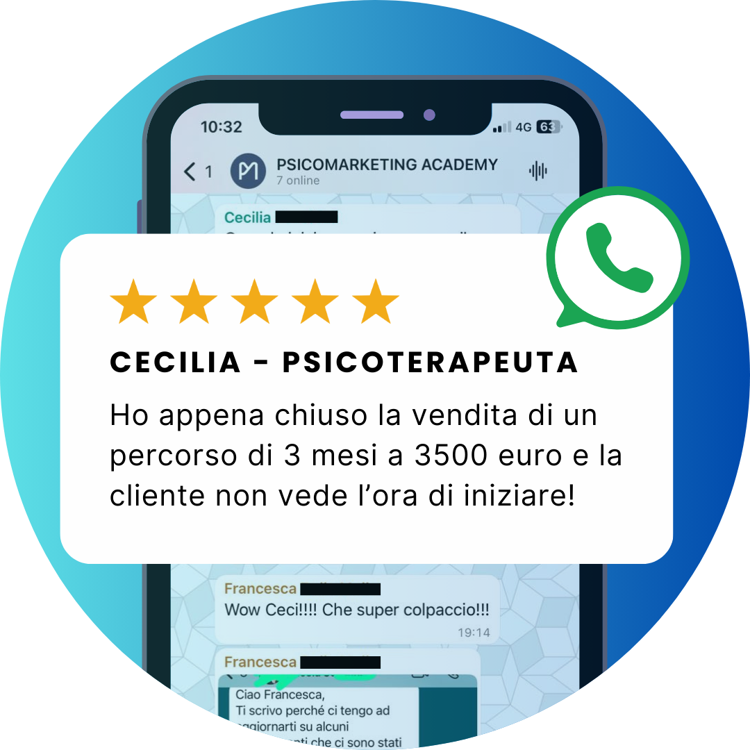 "Cercavo da tempo un corso come questo. Psicomarketing mi ha insegnato che “saper fare bene lo psicologo non basta, bisogna anche sapersi vendere”. È stato un percorso completo, personalizzato e creativo, che mi ha aiutata a tirare fuori i miei punti di forza e a fare il salto di qualità con i clienti. Lo consiglierei alla mia migliore amica: è un acceleratore vero per chi vuole ripartire e fare la differenza"